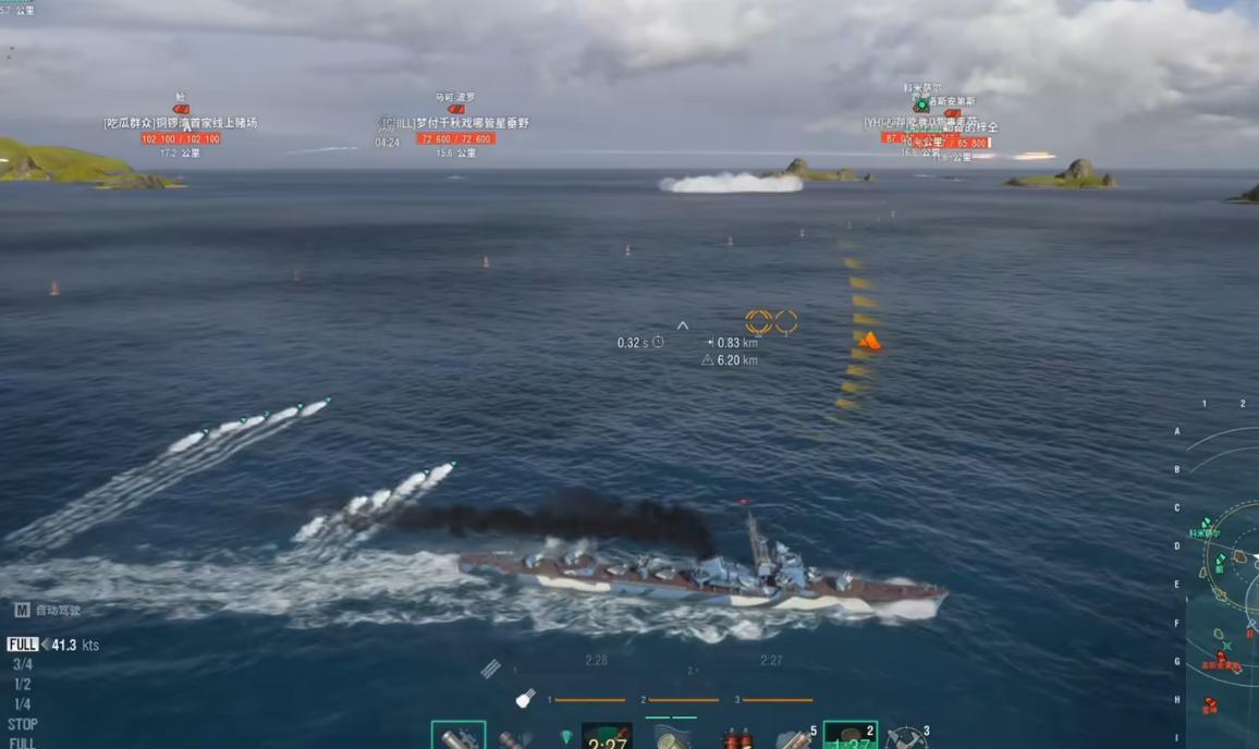 除了現代化主炮,邕安的魚雷也有先進技術加持,它搭載了10發533mm PTA-53-68-bis型魚雷,裝填時間高達150秒,標傷也來到27133,比10級的葵還要高!這款魚雷最大的不足是裝填時間長,而且速度比較慢(45節),用來打驅逐艦或者航速較快的船會比較困難,但如果用來對付戰列艦和航母,或者沒有開水聽的情況下,6.6秒反應時間還是有不錯的命中率。