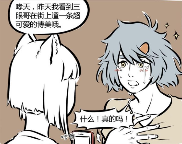 她一看到哮天就十分殘酷地告訴哮天自己昨天看到三眼哥在街上遛一直很可愛的博美,要知道哮天平時最關心的就是三眼哥,尤其是知道他揹着自己遛其他狗,一種背叛和失落瞬間湧上心頭,哪裏還有之前吊兒郎當的樣子,直接變身成憂鬱哭泣帥哥