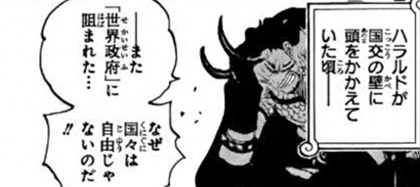 雖然最新話公佈了他的兩個老婆和兩個兒子的出生,但哈拉爾德卻被世界政府搞得一團糟,因爲無法自由的跟其他國家搞貿易等等,讓他十分頭疼,這也埋下了伏筆!讓哈拉爾德開始厭惡世界政府,準備對抗他,而這個關鍵人正是我們熟悉的洛克斯。