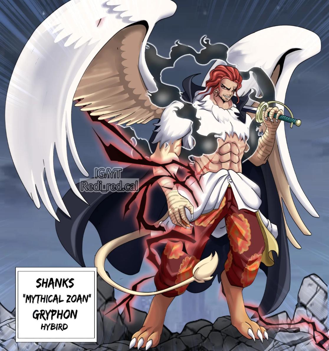 香克斯重返巨人島艾爾巴夫,令人意想不到的是,他竟擁有一顆惡魔果實,其形態爲幻獸種獅鷲形態。