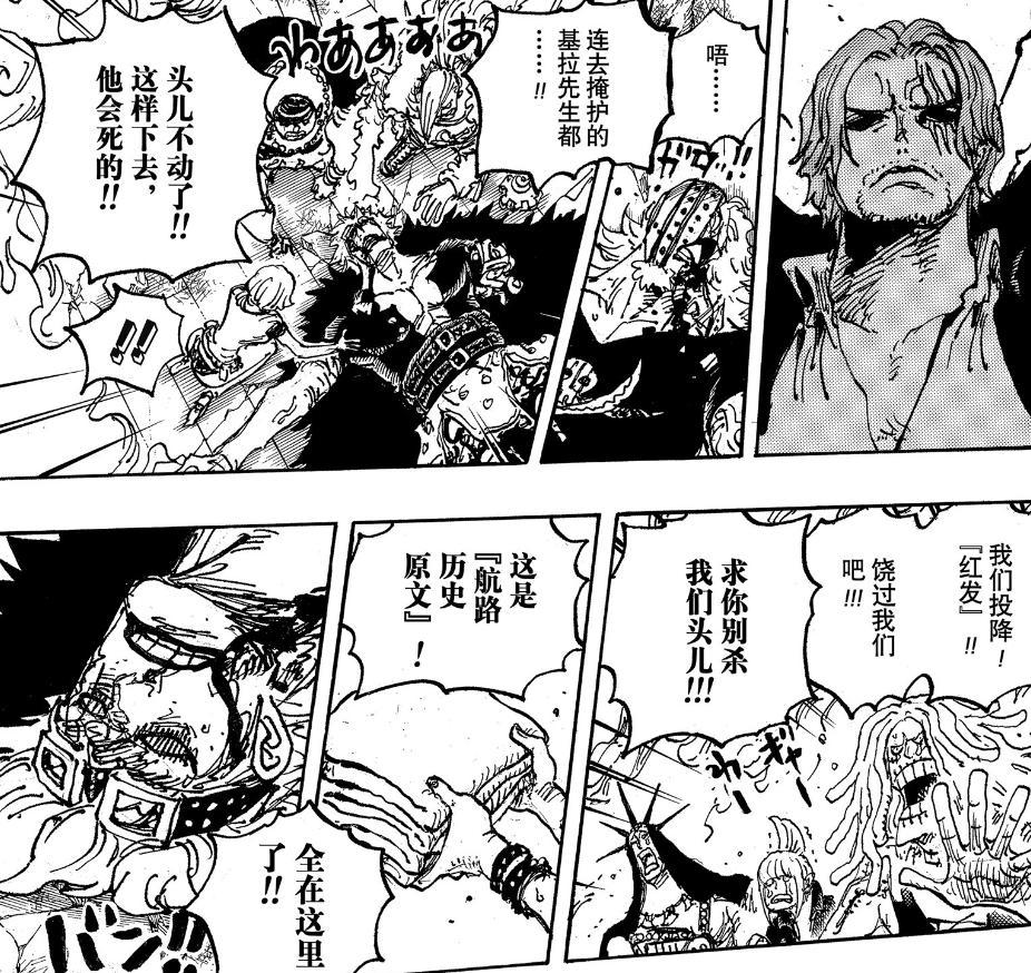 香克斯憑藉絕對的實力,將基德和基拉徹底擊敗,而後指使東利和布洛基摧毀了基德的海賊船,讓他們後續的航行化爲泡影。與此同時,凱多和大媽所持有的兩塊路標歷史正文也落入了香克斯手中。