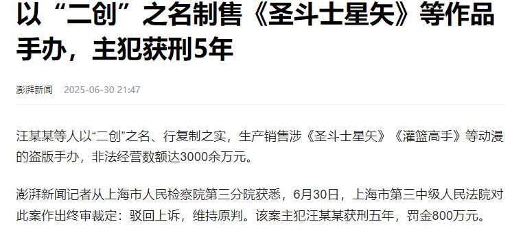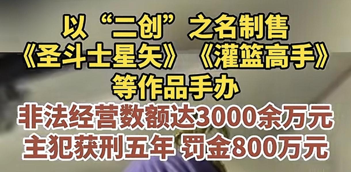 負責盜版手辦產品製作銷售的主犯人員汪某,因爲非法制作並銷售《聖鬥士星矢》《灌籃高手》等知名動漫作品的盜版手辦,直接被宣判五年有期徒刑,並且處罰金800萬元。