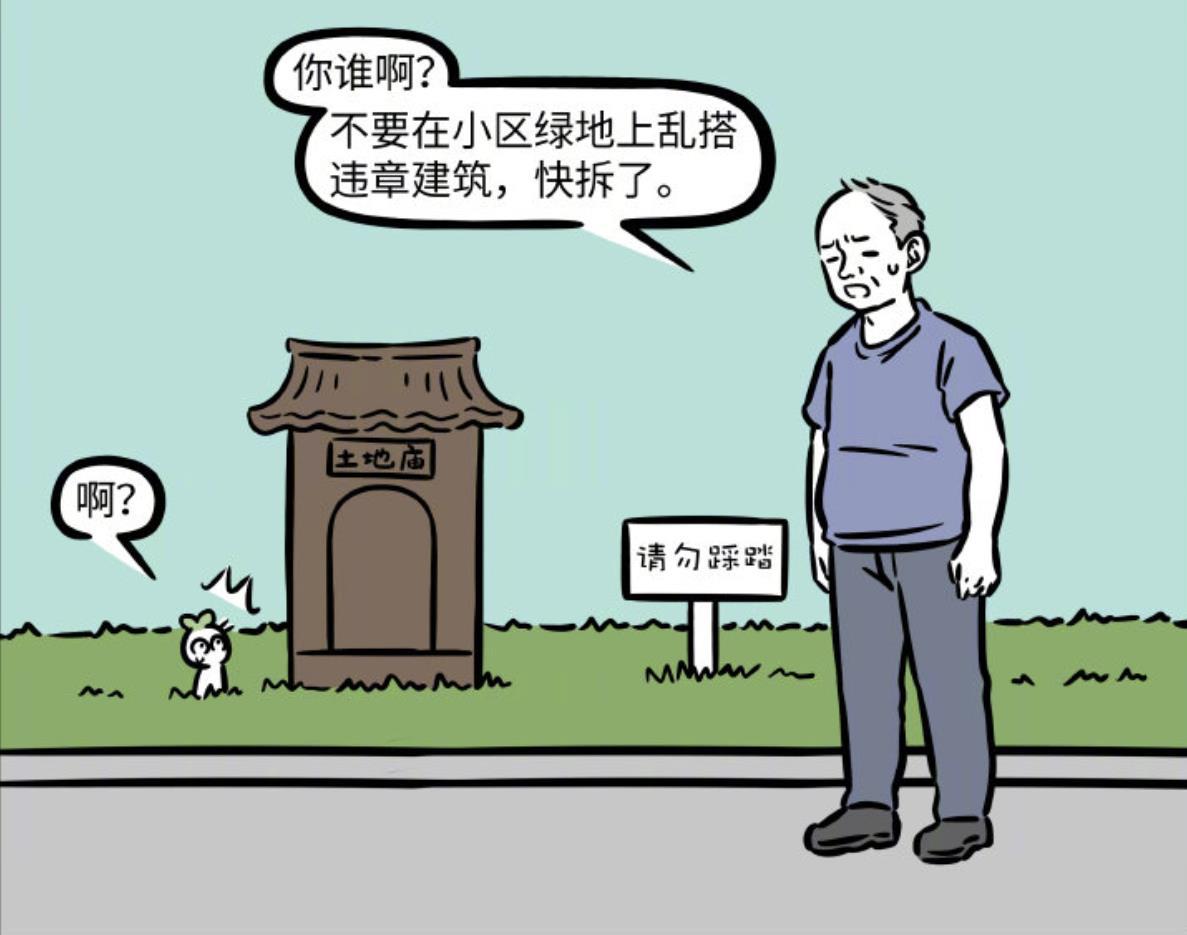 就在土地公爲自己新建造的土地廟而沾沾自喜的時候,一位大爺走了過來,用略帶譴責的語氣讓土地公趕緊把土地廟給拆了。