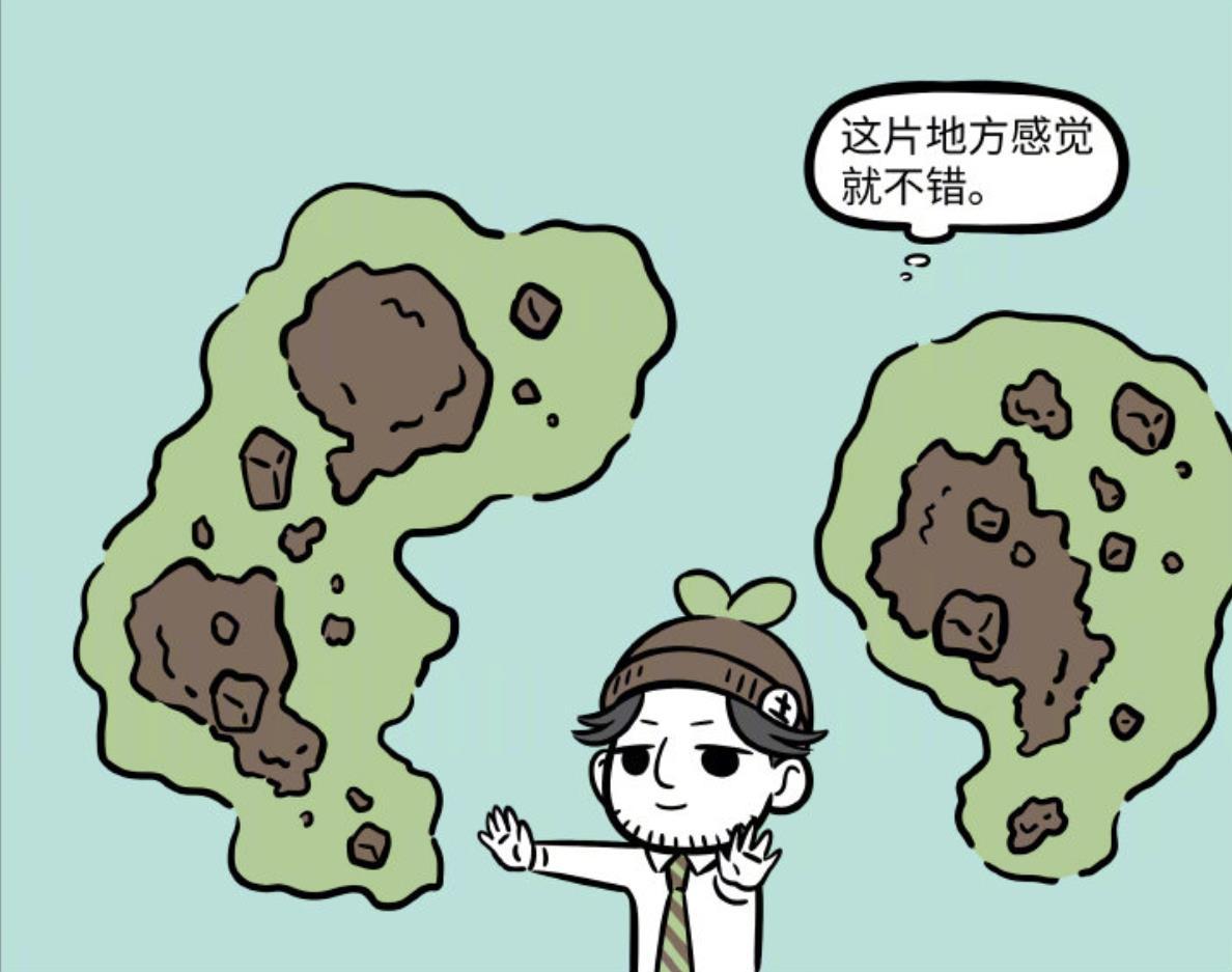 此時的土地公來到一塊草坪上,他發現這塊草坪的感覺十分不錯,因此決定在這裏建造屬於自己的土地廟。