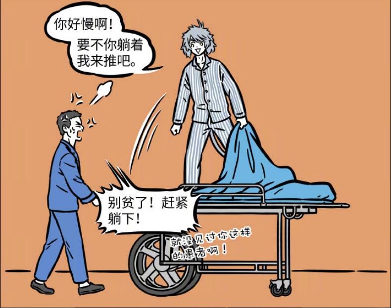 他表示醫院工作人員推的太慢,他躺在牀上有點不得勁,因此表示要不然工作人員躺牀上,他來推,速度肯定可以更快一點。