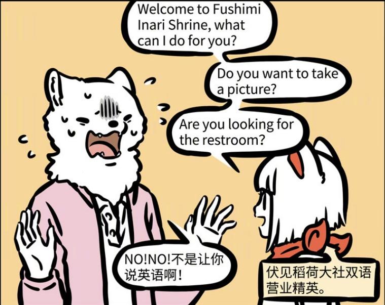 別看小女孩年齡小,但其實他本人可是伏見稻荷大社的雙語營業精英,日語自然不必多說,英語對話更是十分流暢。