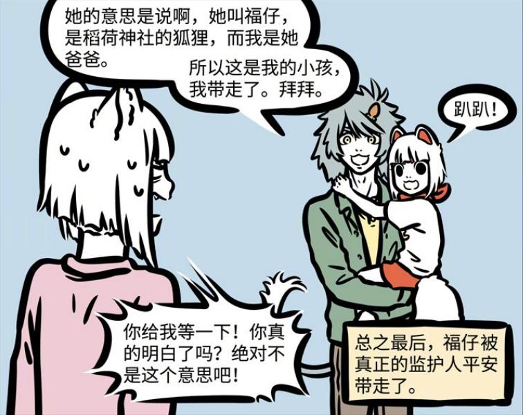 只見他抱起小女孩,表示小女孩的名字叫福仔,是稻荷神社的狐狸,而哮天則是他的爸爸,所以福仔就是他的小孩,現在他準備帶福仔回家。