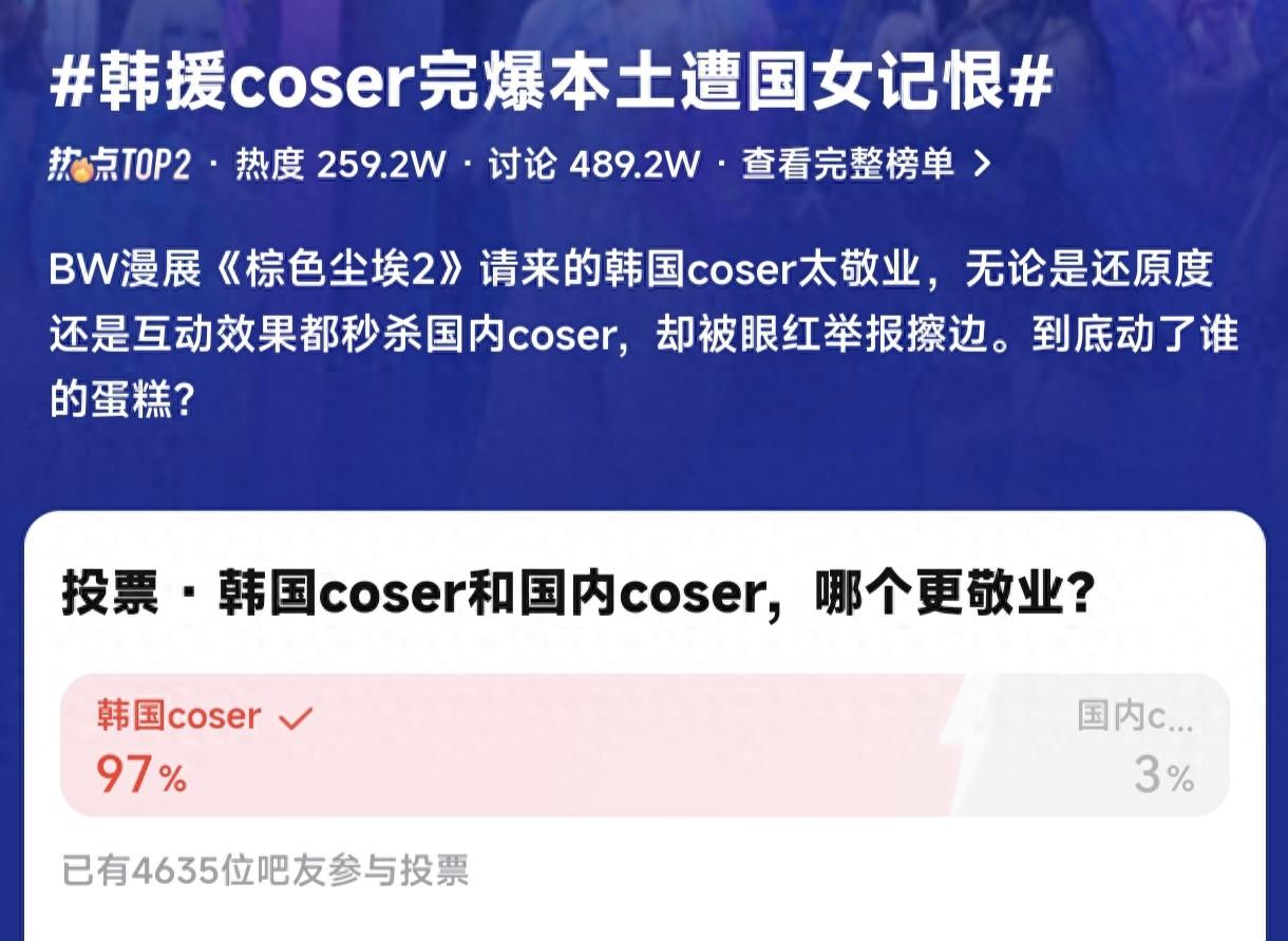 導讀:2025年7月12日,一個名爲“韓援coser完爆本土遭國女記恨”的話題帖子登上貼吧論壇熱搜。