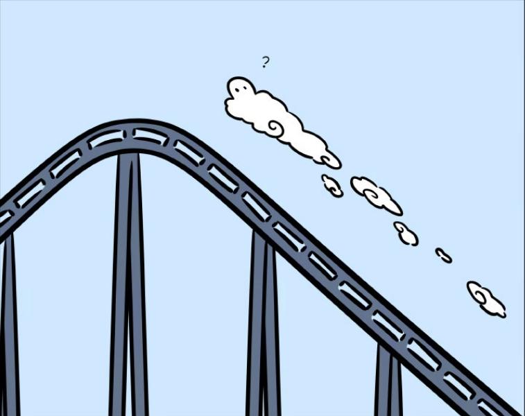 因爲下坡速度太快,筋斗雲維持不住雲朵狀態,頭部直接消失,只剩下半個身體留在過山車上。