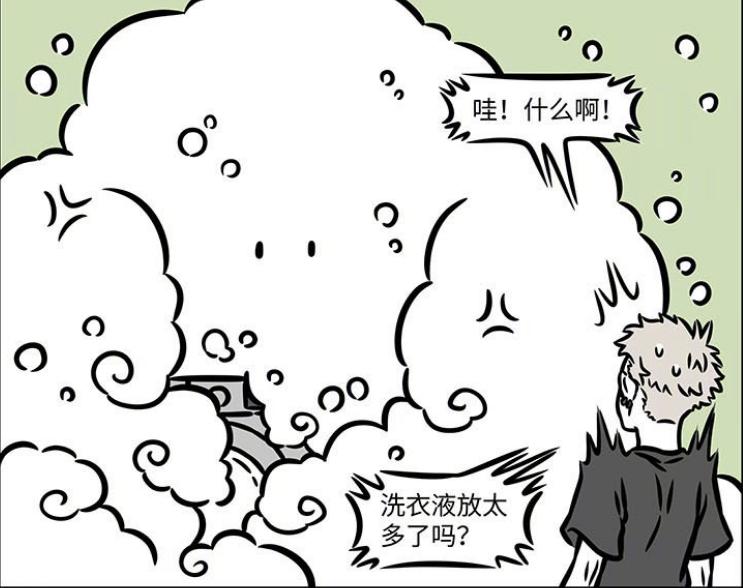 不知從什麼時候開始,筋斗雲已經自身體積膨脹,衝出了洗衣機,全身上下散發着還沒有完全沖洗乾淨的泡泡。