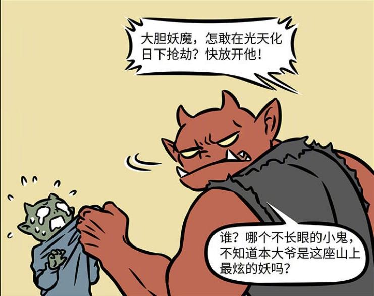 估計很少受到挑釁,紅色皮膚的大妖怪停下動作,轉頭看了下制止他的人是誰,嘴裏面還在嘟囔着來人不長眼,畢竟自己可是這座山最炫的妖怪,誰膽子這麼大竟然還敢駁斥他。