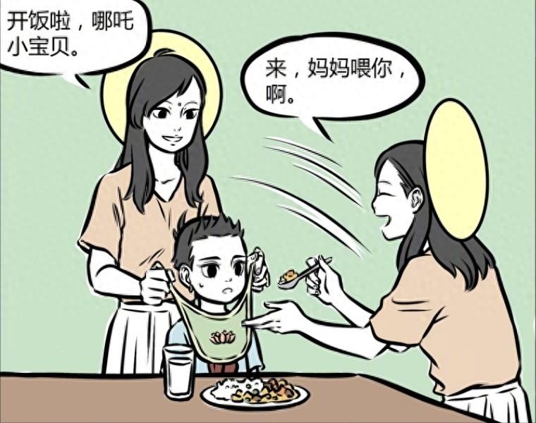 這天哪吒喫飯,大是直接分出一個身體,一個給哪吒寄圍兜,一個則是耐心的給哪吒餵飯,一口一個小寶貝直接把哪吒給叫懵。
