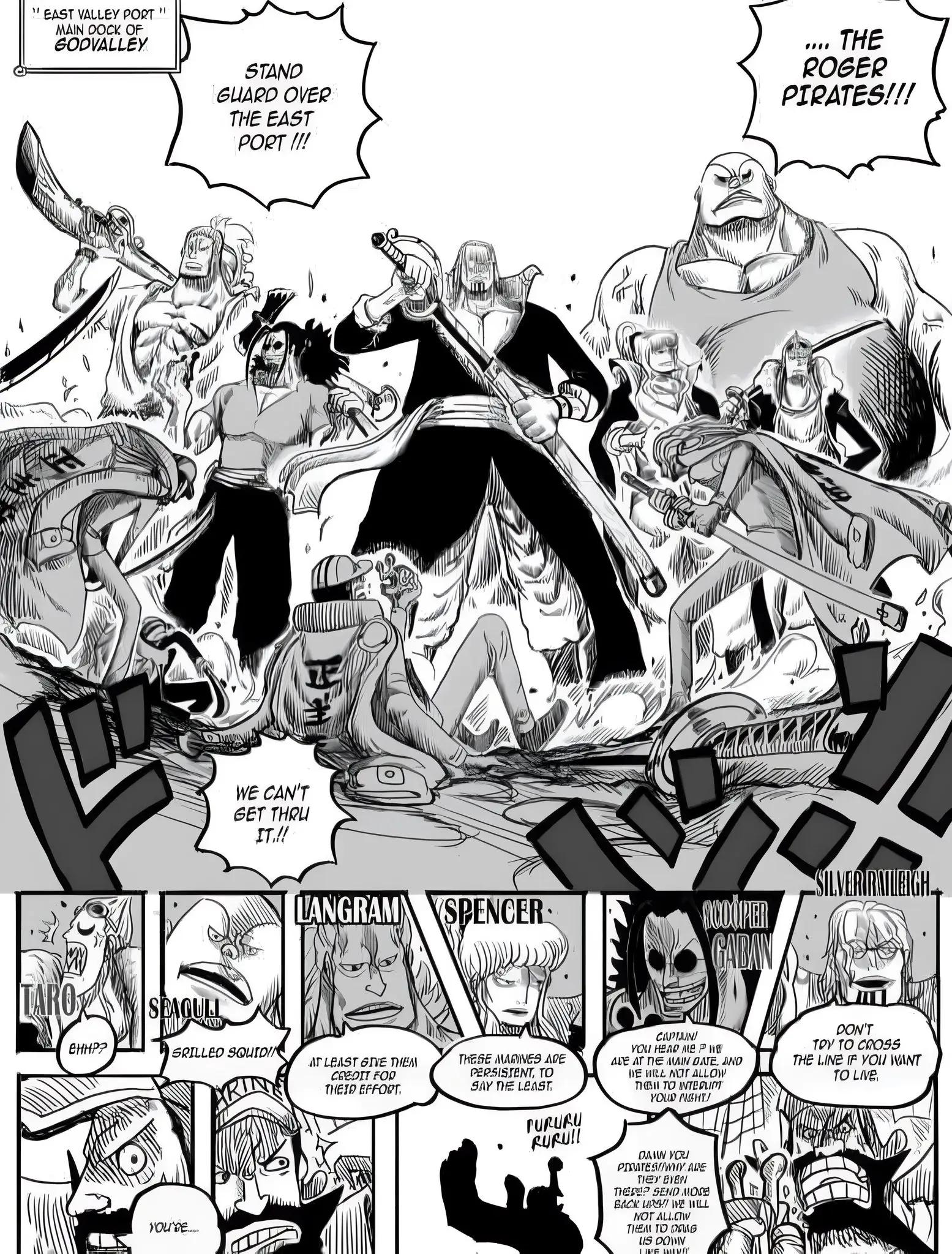 鏡頭給到羅傑海賊團,雷利他們負責對付海軍和神之騎士團,唯有將這些人攔下,纔不會讓奴隸犧牲更多,更何況大熊的肉球果實也在瘋狂的解救奴隸們。