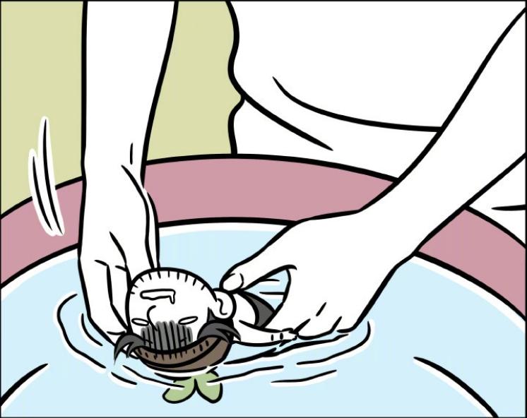 隨後九月就將餓暈了的土地公放進清水裏面進行揉搓。