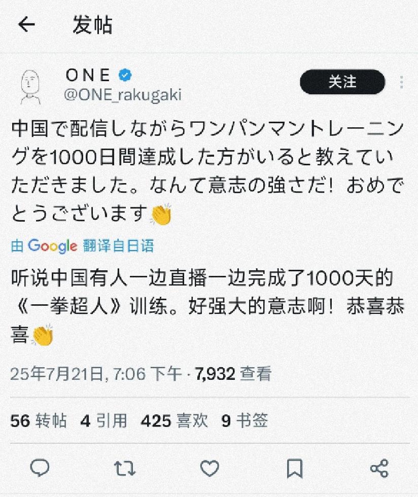 同一時刻,身在日本的《一拳超人》漫畫原作者ONE老師,也得知了他完成琦玉式訓練的消息,特意發文祝賀:“我聽說中國有人在直播期間完成了連續1000天《一拳超人》訓練,這是何等強大的意志力!恭喜。”