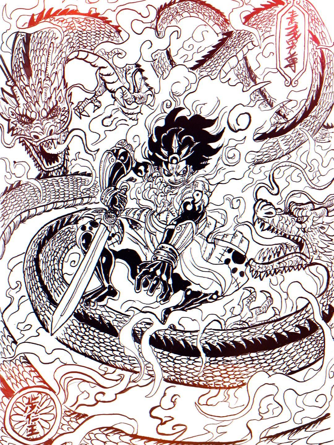 路飛毫無保留,充分藉助艾爾巴夫獨特的環境以及巨型動物的特質,成功創造出一種全新形態——融合了四檔蛇人與五檔尼卡特點的尼卡蛇人形態。此形態霸氣十足、英姿颯爽!憑藉尼卡那堪稱“bug”般的憑空造物能力,路飛直接變幻出兩條覆有龍鱗的巨蛇,它們彷彿即將化身爲蛟龍、真龍,威風凜凜。