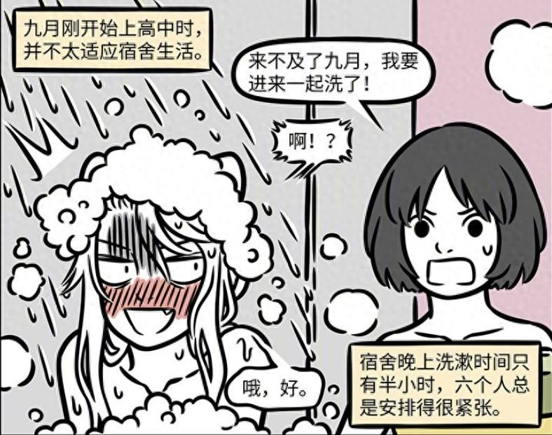 九月讀高中時候,宿舍的洗漱時間一般只有半個小時,六個人洗澡時間上就有些勉強,爲了保證每個人都能洗到澡,有些同學會選擇一起洗澡,但九月顯然不太能接受,面對突然闖進來的同學,忍不住小臉通紅,但爲了不露怯,九月還是答應了對方的要求