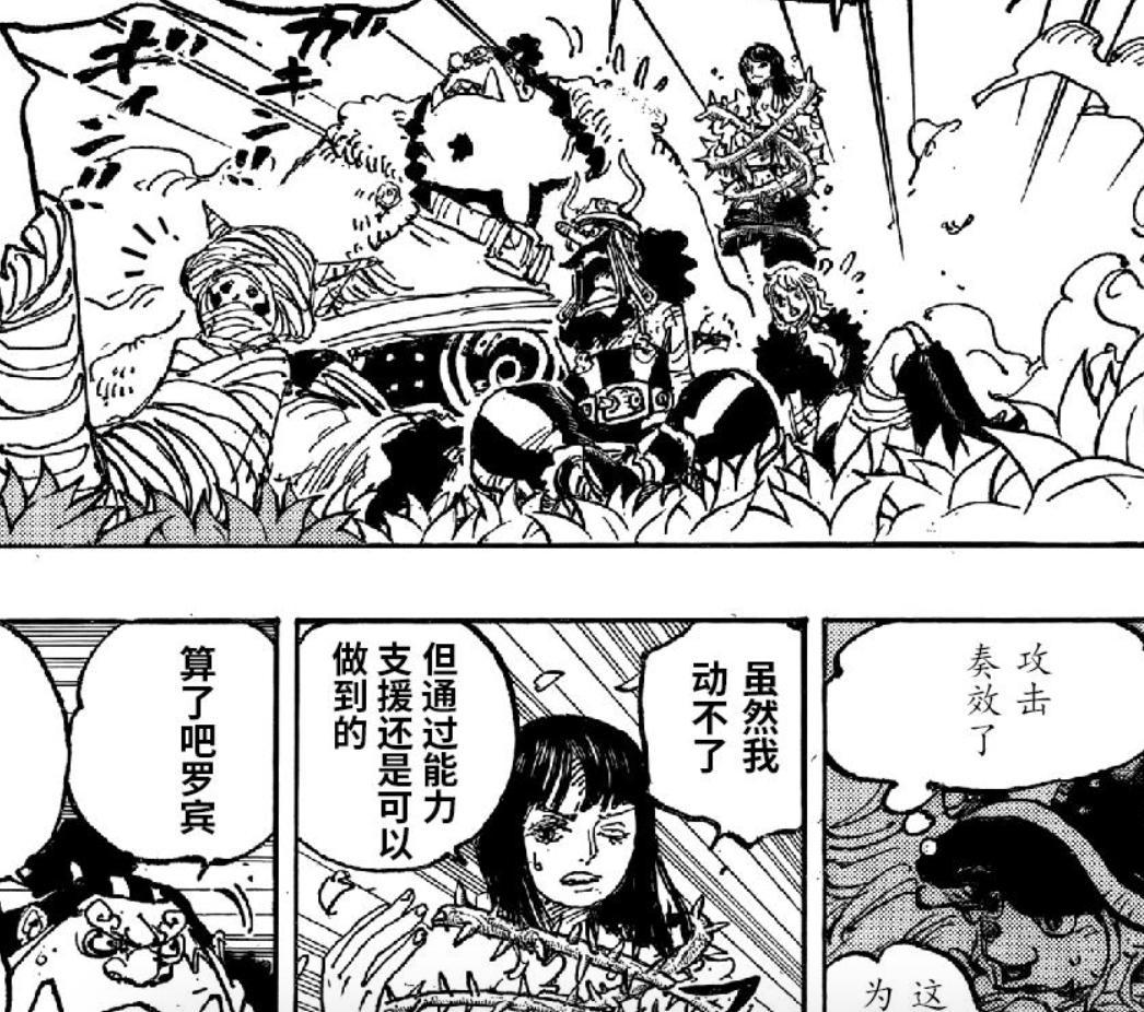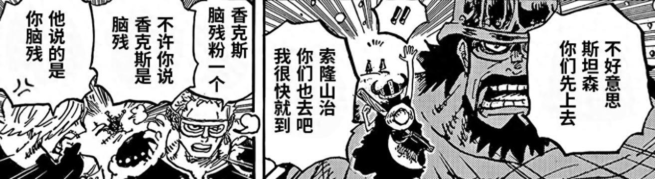 因爲路飛和海爾丁聽洛基講故事,所以索隆和山治他們先跟新巨兵海賊團的幾位巨人上去,他們也能處理掉夢妖和被惡魔化的巨人們,同時解救出夥伴們,再一起對付敵人,營救巨人孩子們。