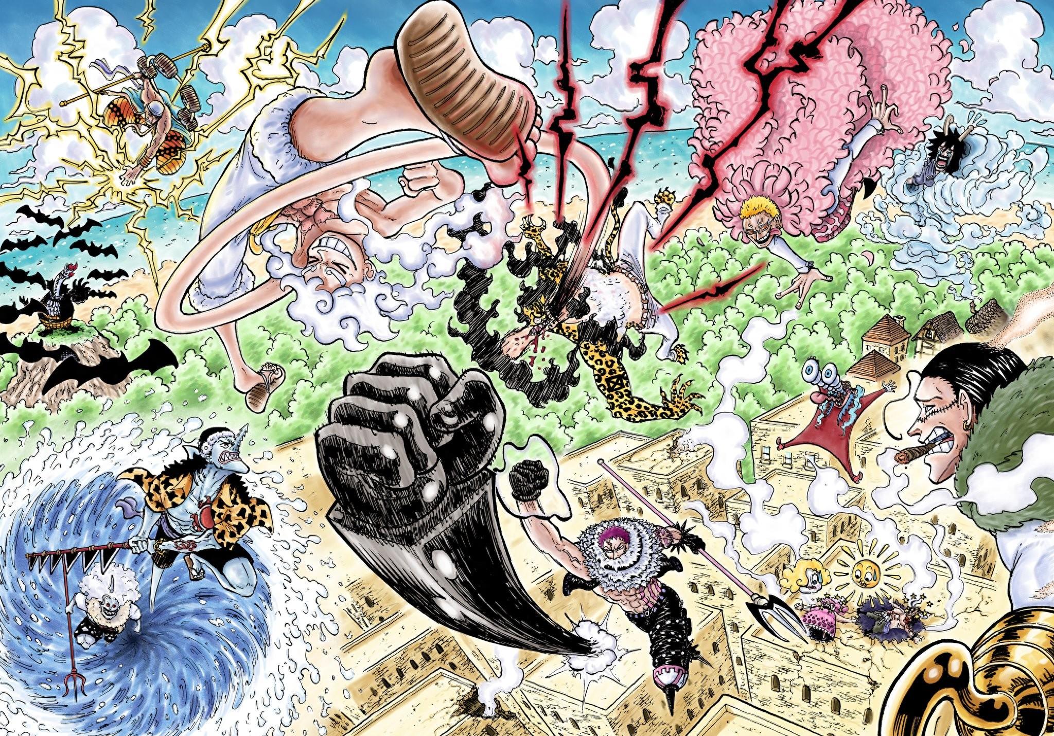 在最新一話中,我們將目睹一幅極爲壯觀的跨頁畫面:草帽海賊團一行人再度集結,各自施展看家本領。唯有路飛暫未開啓五檔尼卡形態,先用四檔打頭陣。索隆則開啓了九刀流,令人好奇的是,山治的戰鬥服不知何時恢復的,莫非是偷偷找貝加龐克修復的?