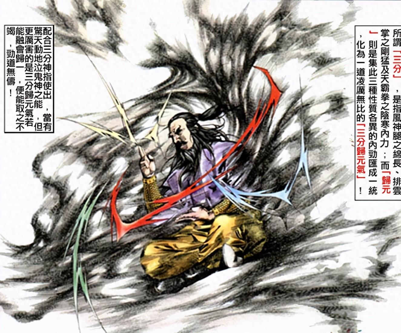 在《風雲》第一部中,雄霸的武功“風神腿”、“天霜拳”、“排雲掌”合稱“三分歸元氣”,乃是當時武林中最頂尖的內功體系之一。漫畫中明確提到,風神腿速度可超越光速,天霜拳練至極致能凍結空間,排雲掌則剛猛無儔,三者融合後形成攻防一體的完美武學結構。這並非誇張設定,而是劇情中多次展現其實戰威力的體現。