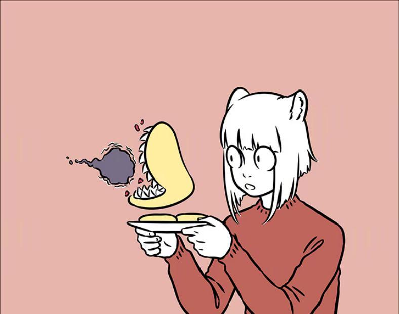 而在九月還沒有注意到的時候,原本還在盤子裏面的鮮花餅突然張開大口,將邪祟給吞了進去