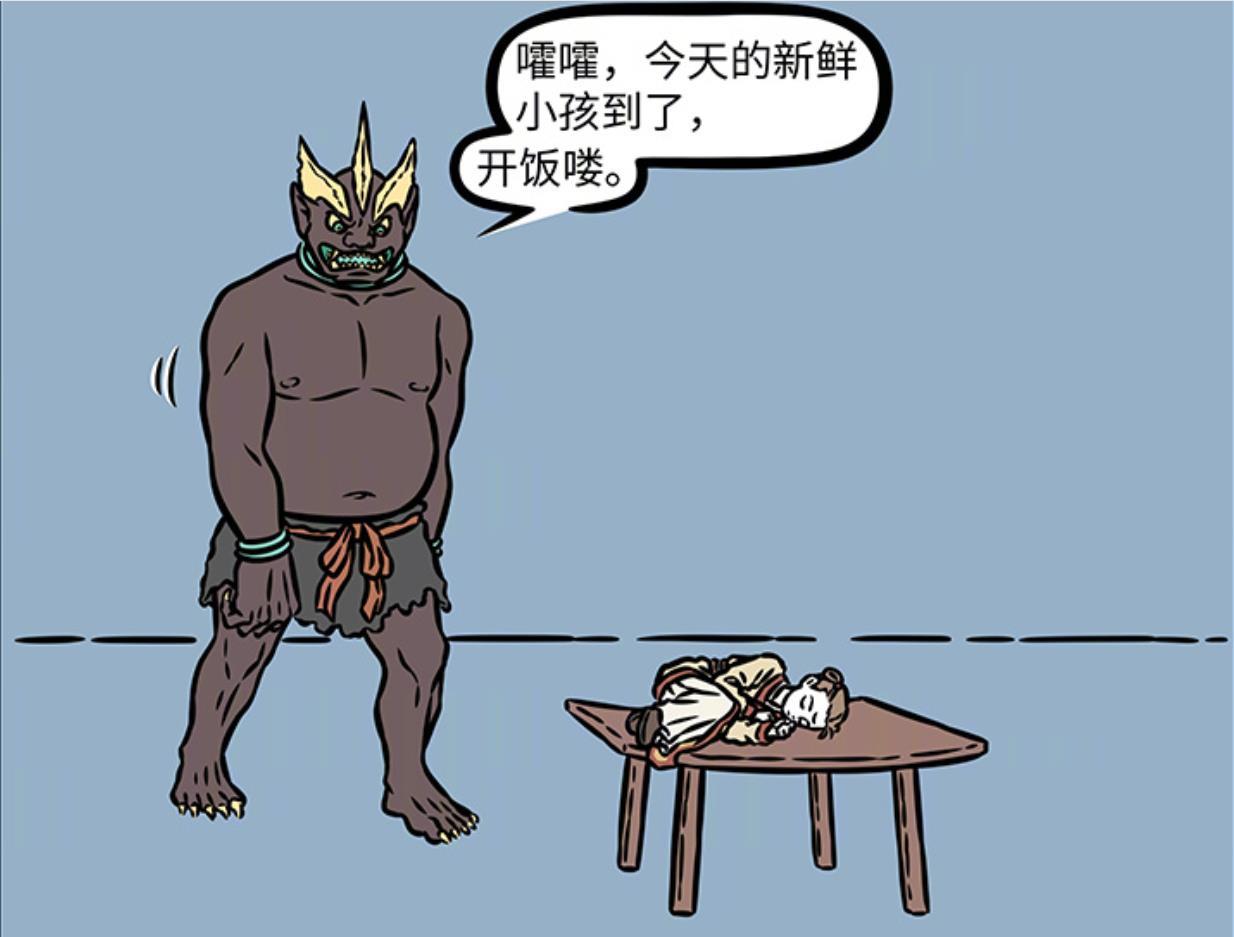 隨後鏡頭一轉來到斧王這邊,他又開始品嚐今天的美味大餐,此時桌上躺着一個小孩,從外形可以看出,這個小孩正是大家熟悉的楊戩