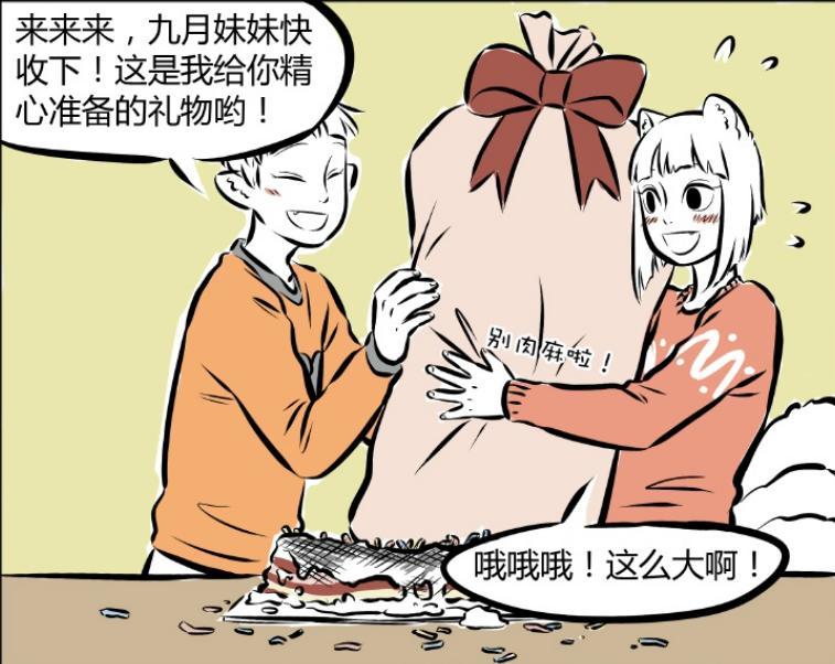 看到十一月準備的禮物,九月不可避免露出靦腆的微笑,表示竟然這麼大,估計也是很少收到十一月贈送的大禮物,多少有點受寵若驚了