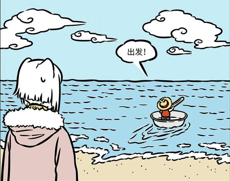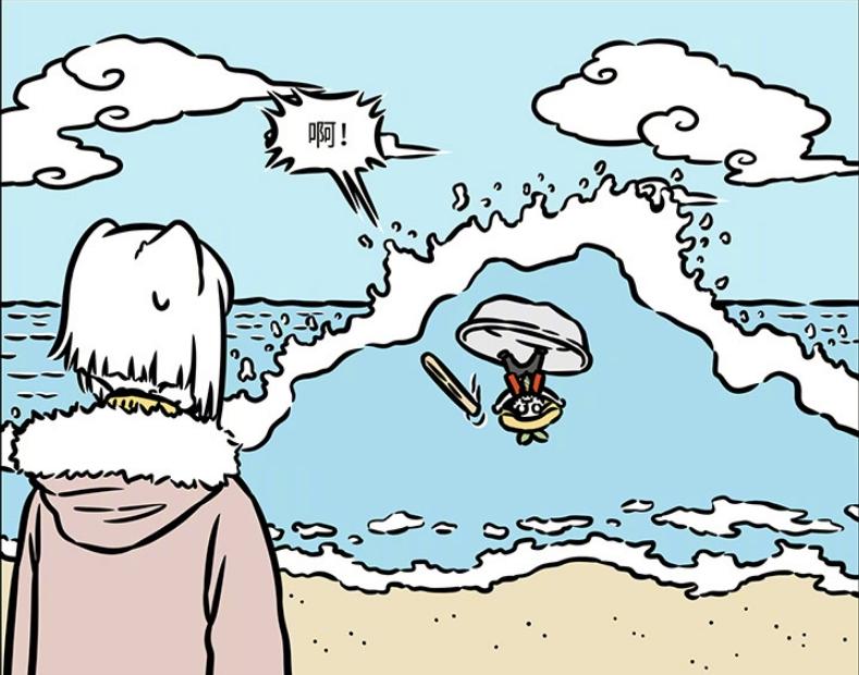 隨後就看到土地公划着一個小盆準備出海,儘管土地公看起來躊躇滿志,但從九月的背影和遲遲沒有離開的身影,足以看出九月對土地公十分不放心。