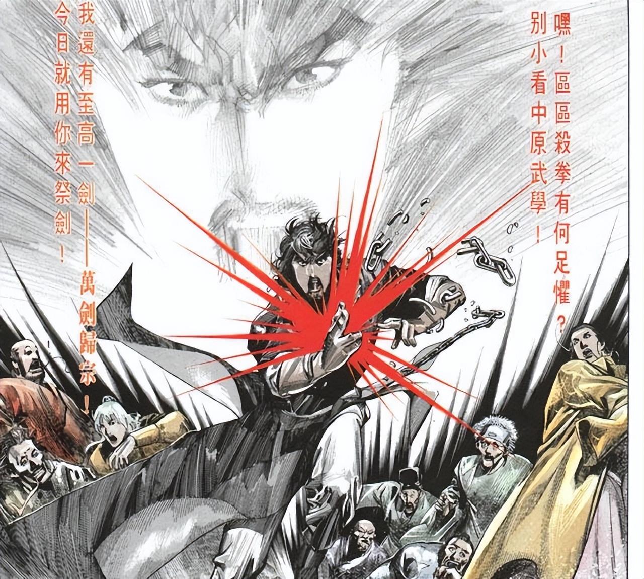 其次,它的招式表現極具視覺衝擊力。千百道劍氣凝形如實體長劍,鋪天蓋地席捲而出,氣勢磅礴,凌厲無匹。這種兼具美感與威力的呈現方式,在90年代港漫盛行的時代極具吸引力。對於許多讀者而言,“帥”本身就是一種實力象徵。單憑這份驚豔的出場效果,萬劍歸宗便足以躋身頂級武學之列。