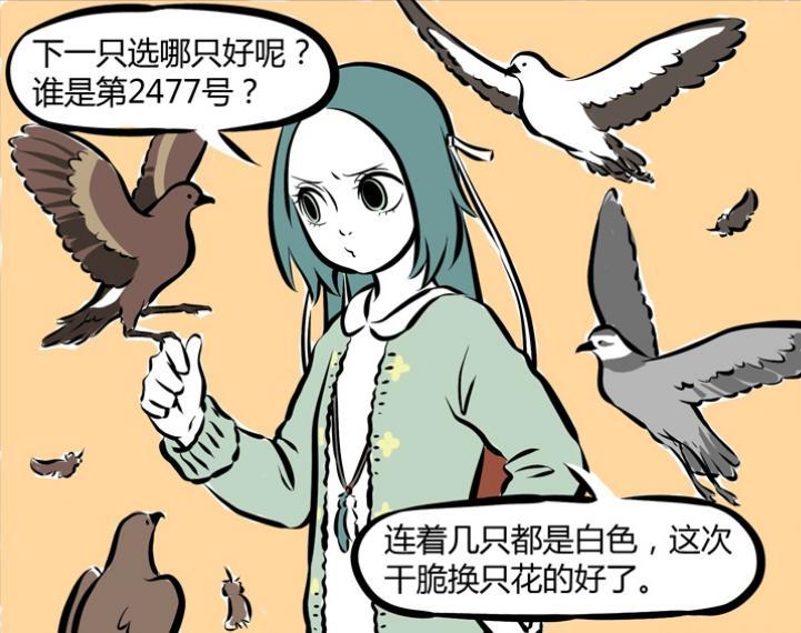精衛表示之前連着好幾只都是白色小鳥,這次她準備換一隻其他花色的,因此在一堆不同花色的小鳥中進行選擇,選擇自己的下一任丈夫,壓根不理會現任海燕的死活,頗有種渣女的既視感