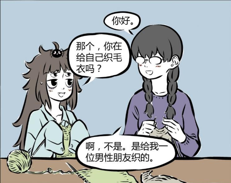 小蜘蛛精詢問雙馬尾眼鏡女是在給自己織毛衣嗎,雙馬尾眼鏡女表示自己是在給一名男性朋友織毛衣。