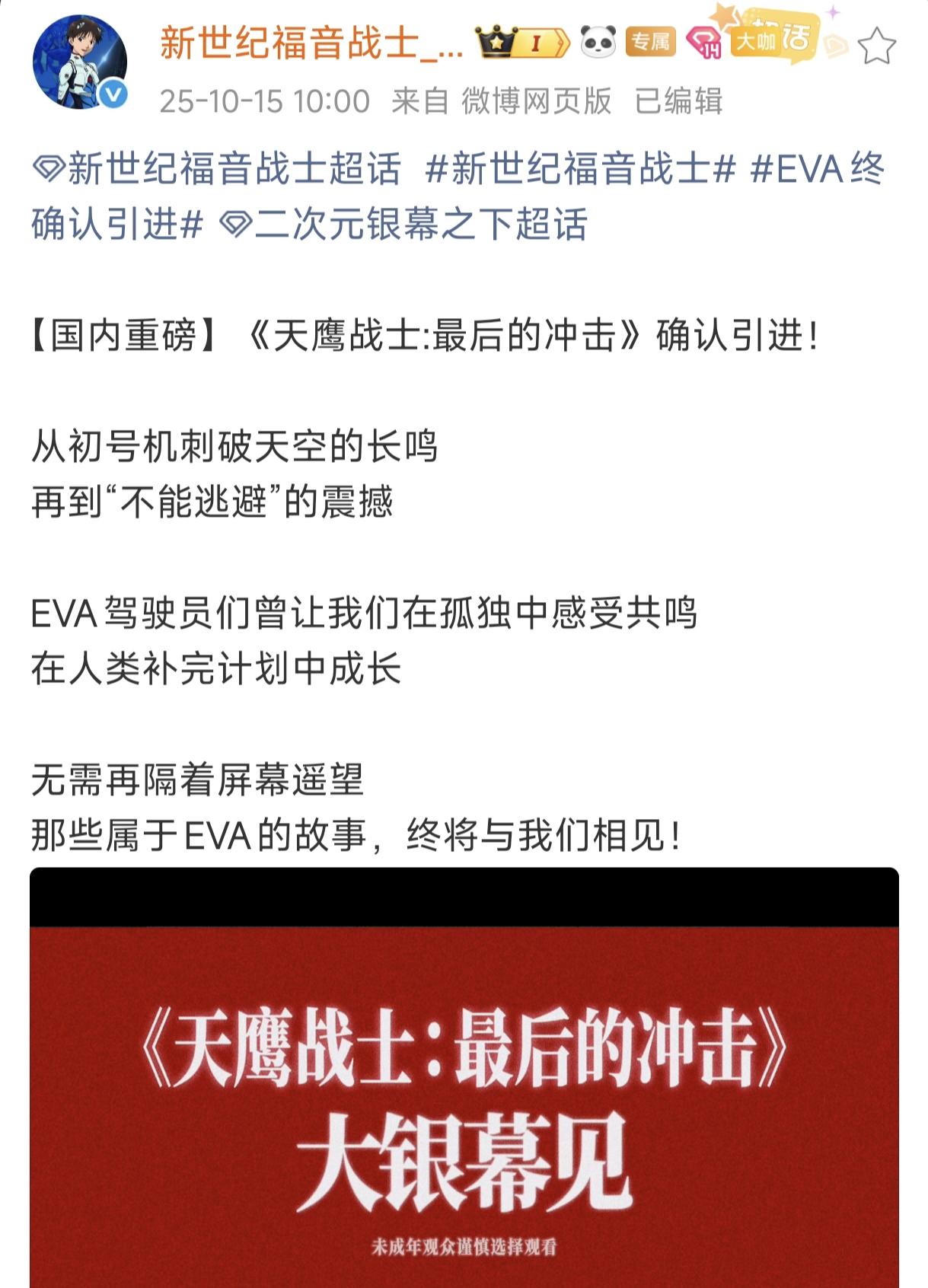 而這一延緩,又是過去兩年多的時間,直到近期2025年10月15日,《新世界福音戰士》國內官方再次發佈通知,該動畫電影確定引入國內影院。