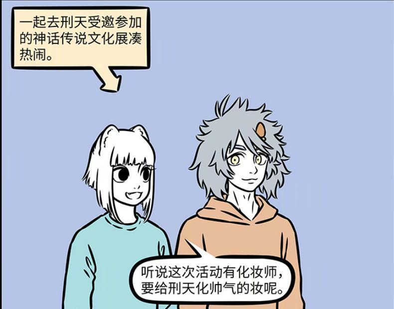 除了普通員工,作爲遠古神明的刑天有些時候也會受到一些活動邀請,作爲演出嘉賓,比如現在刑天就受邀參加神話傳說文化展,而九月和哮天作爲刑天的好同事兼好朋友,也來看刑天的本次演出。
