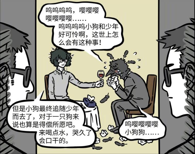 隨後就看到黑鳥王拿着紙巾在痛哭,已經完全沉浸在少年和小狗的悲劇故事中,而一旁的白澤則拿着紅酒安慰黑鳥王