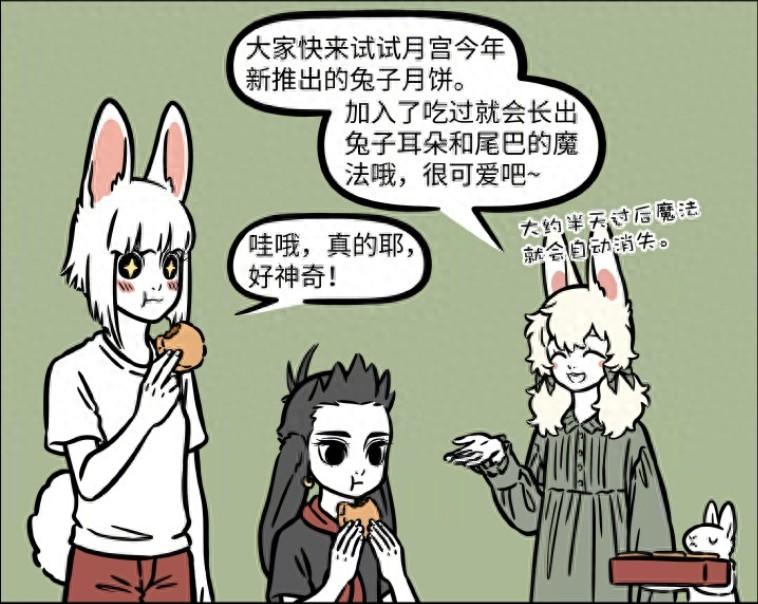 爲此九月特意將新品種月餅拿給九月和哪吒試試,喫過月餅的兩人立刻展出兔子耳朵和尾巴,九月是白兔,哪吒則是黑色的垂耳兔,兩人都很可愛