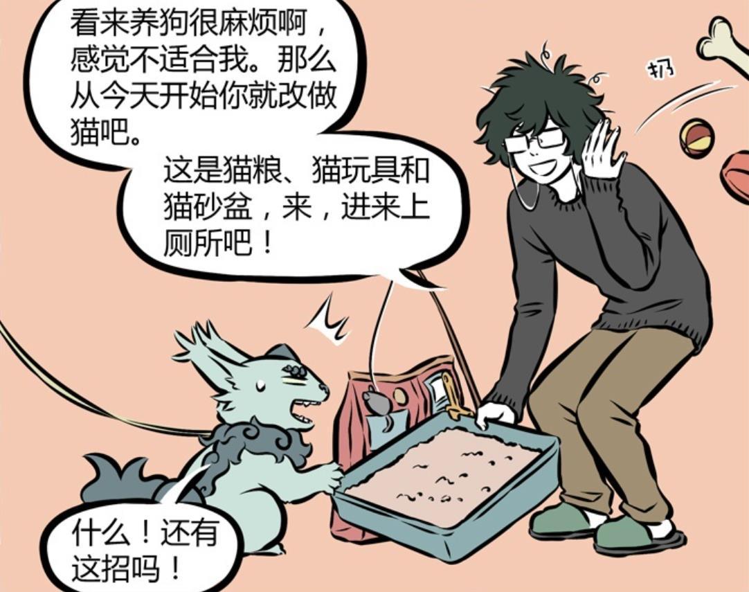 他表示聽到年獸這麼說,他覺得養狗果然十分麻煩,感覺養狗並不適合自己,因此他決定把年獸當成貓咪來養,他之前離開只是去找貓砂盆、貓糧和貓咪玩具。