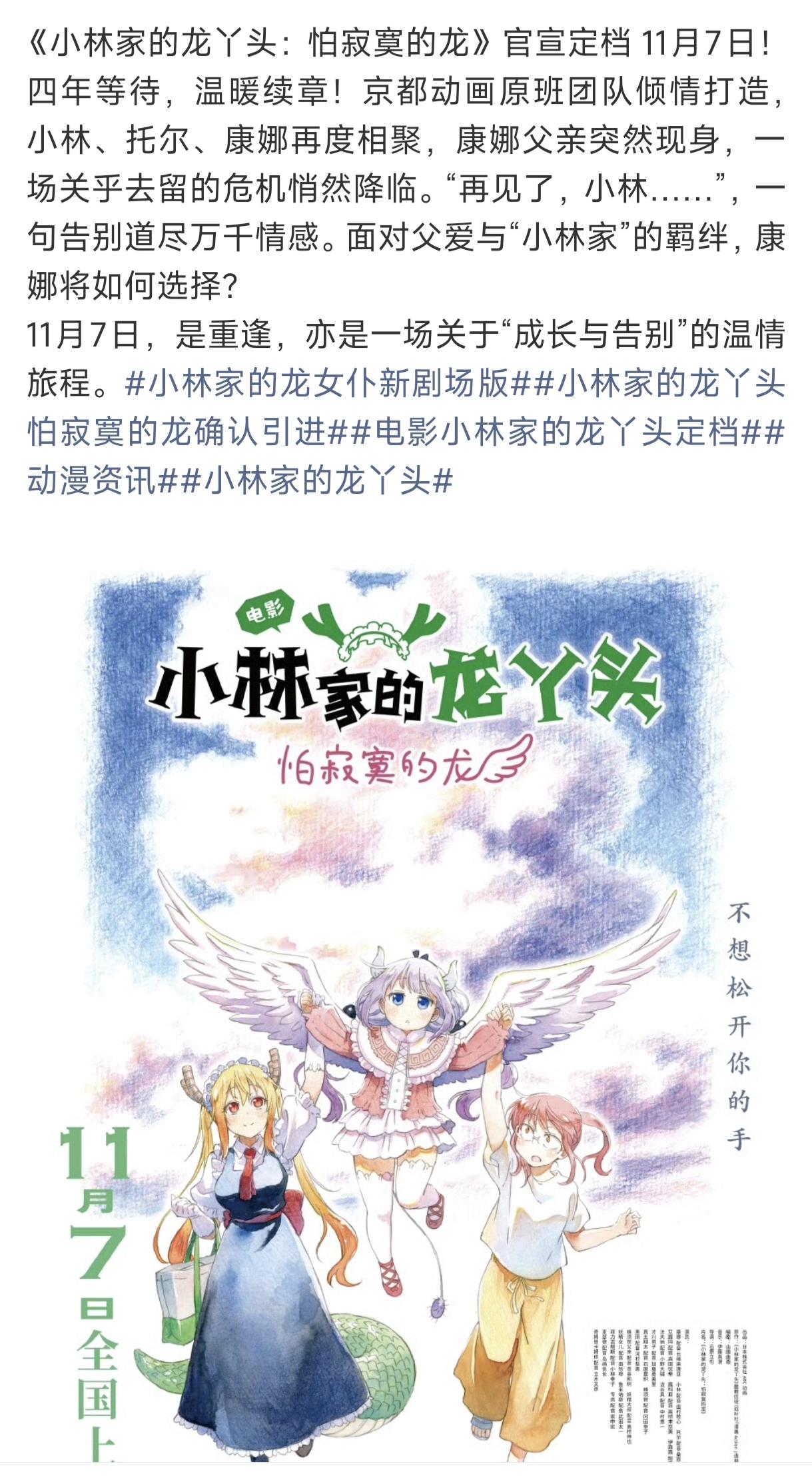 導讀:2025年10月23日,日本人氣動畫《小龍家的龍女僕》劇場版《怕寂寞的龍》在中國大陸正式官宣定檔,劇場版動畫將會在11月7日正式上線國內影院。