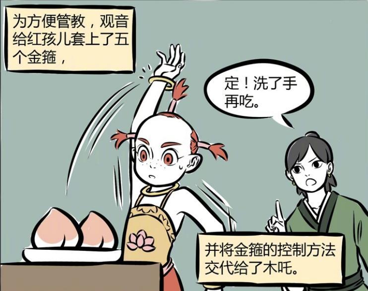 當然對於還處於熊孩子來說,只是單純哄着可能不行,爲了減輕木吒的壓力,也爲了避免紅孩兒惹出大禍,大士還是給紅孩兒帶上孫悟空同框的五個金箍,並且還將金箍的使用方法一併告知木吒。