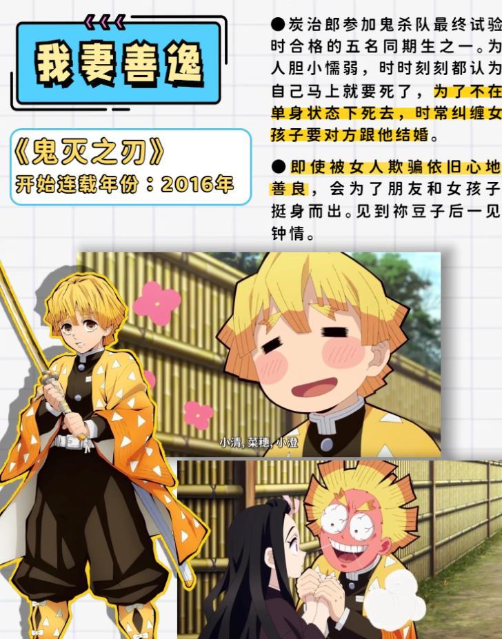 我妻善逸算是近幾年最成功的lsp角色,一出場就是對女生死纏爛打,幾乎不放過遇到的各種美女,直到對禰豆子一見鍾情,sp屬性纔有所減弱