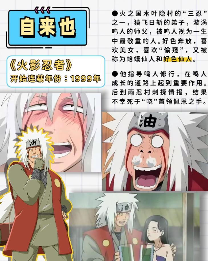 雖然屬於傳說中的人物,但自來也性格卻多少有些脫線,好色奔放、喜歡美女,甚至還是親熱天堂的作者,妥妥的爲老不尊lsp