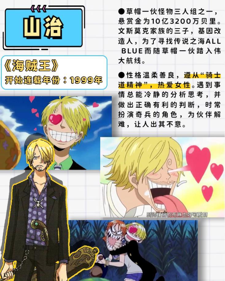 當然好色只是表現,山治性格的本質是徹徹底底的騎士精神,溫柔善良,尊重每一位女性,也因此收穫了不少女生的芳心