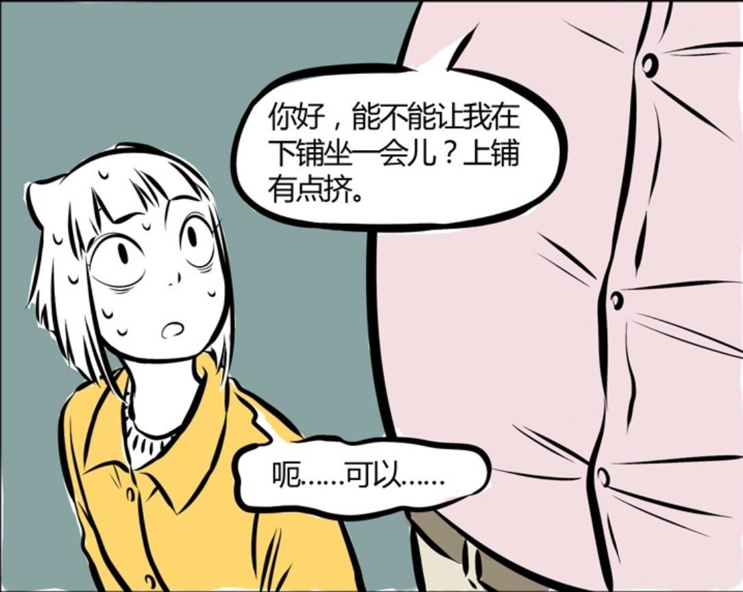 也不知道是不是被上鋪乘客的體型震驚到,九月滿臉震驚,只是猶豫了瞬間,便答應了上鋪乘客的要求