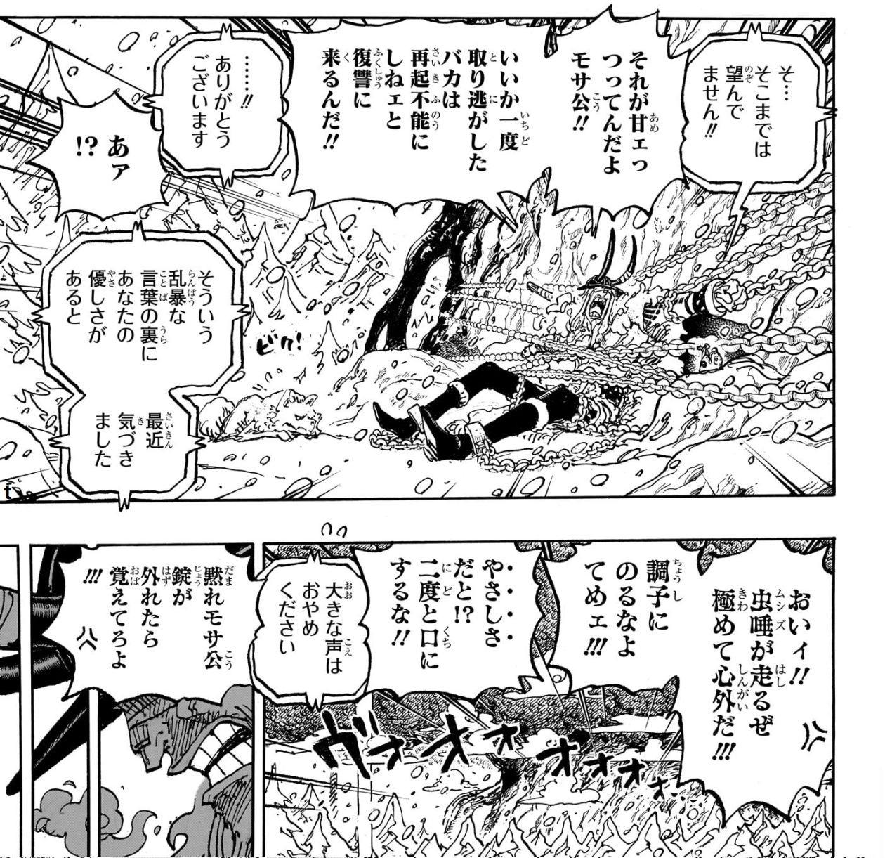 爲什麼這麼說呢!因爲哈拉爾德對尼普頓說“爲你毛茸茸的女兒乾杯”,原文爲“モサモサ(發音爲mosamosa莫薩莫薩)”,而非情報師強調的967話羅傑和尼普頓交談時用的“モジャモジャ(發音爲mojyamojya)”這樣的話對比1134話,與洛基通話的人名是“モサ公”,“モサ”和1167話出現的一模一樣。