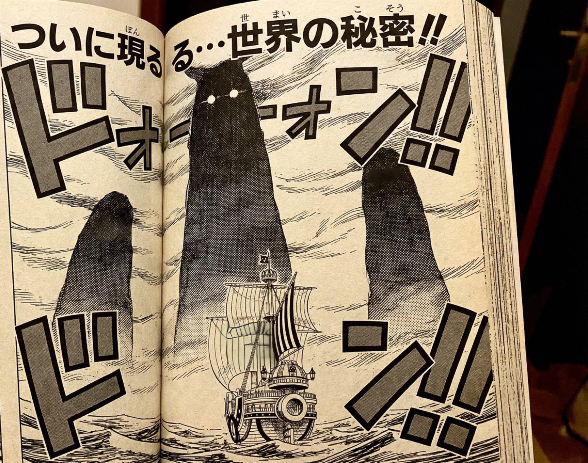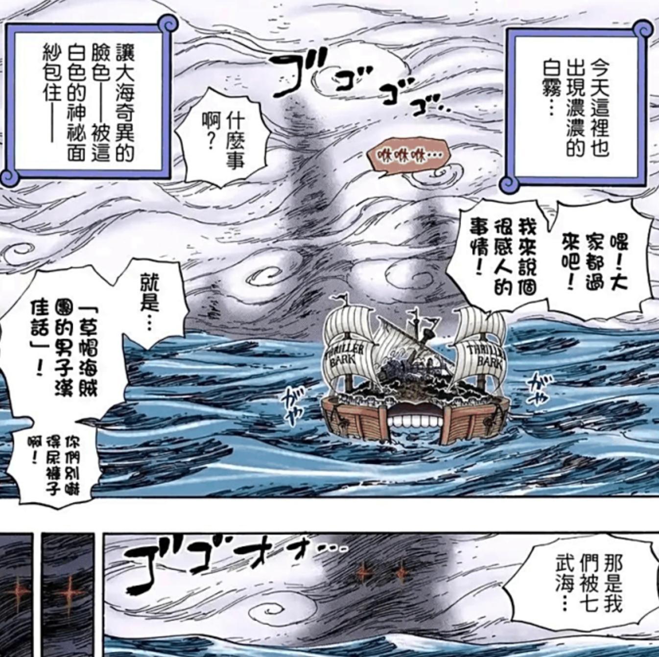 而當初出現的巨大黑影就是古代兵器天王和伊姆在盯着路飛一行人,以爲他們會往他們那邊去,但結果並沒有,只是莫利亞的恐怖三桅帆船向裏面移動罷了。