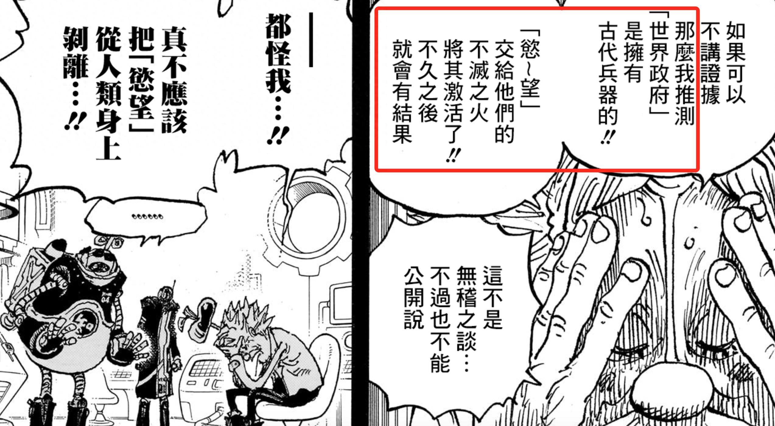 之前的露露西亞王國被毀滅一事,就是慾望約克偷偷拿了【不滅之火】給了五老星,才引發這個事故。因此貝加龐克推斷世界政府真的擁有古代兵器,只是他不知道是哪個,但我們動漫迷自然知曉是【天王】。