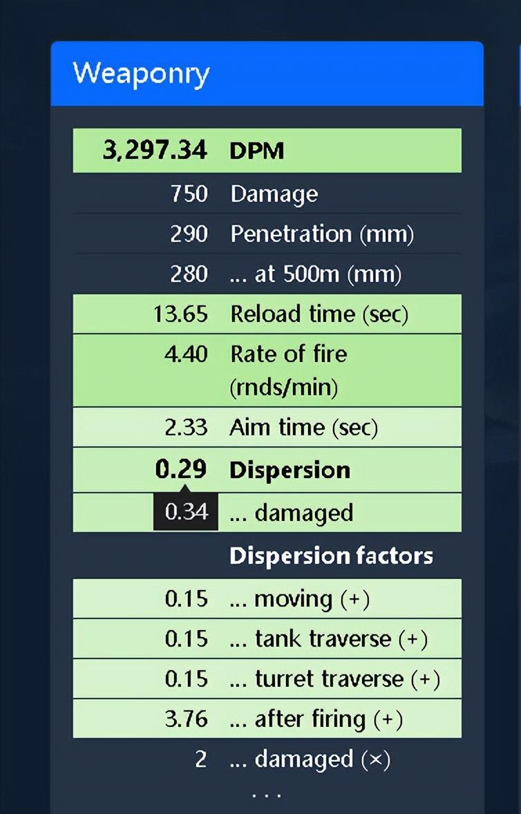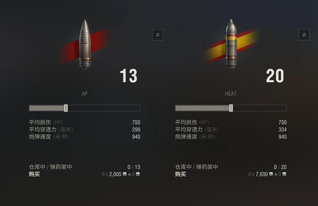 而且其炮彈性能也不錯:銀幣彈是290毫米穿深的AP,和百突的銀幣彈穿深相當。高穿深加上大口徑,使得它天然就具備不錯的擊穿率。金幣彈配備的是祖傳334毫米穿深的HEAT,即便是在十一級房也有一戰之力。而所有炮彈的彈速均爲940m/s,手感相當,可以學一個加彈速的技能改善。