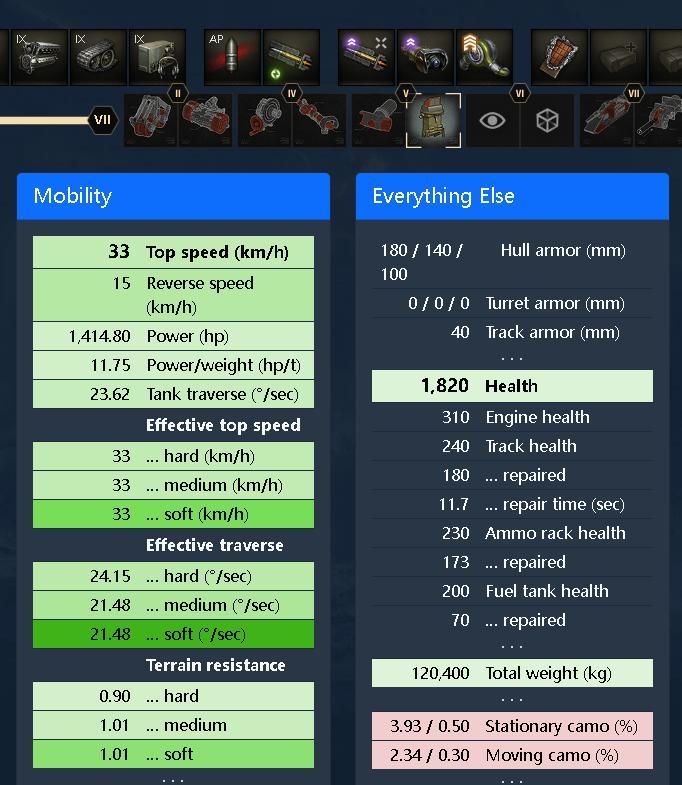 機動性方面,10.92的推重比和28公里的極速使得E90坦殲的機動合乎刻板印象的德系坦克。但相對來說更要命的是旋轉速度僅21度,對一臺前置戰鬥室還要上前線戰鬥的坦殲來說不是一個好消息。所以E90坦殲急需橙渦輪,或是紅渦輪來優化機動性。