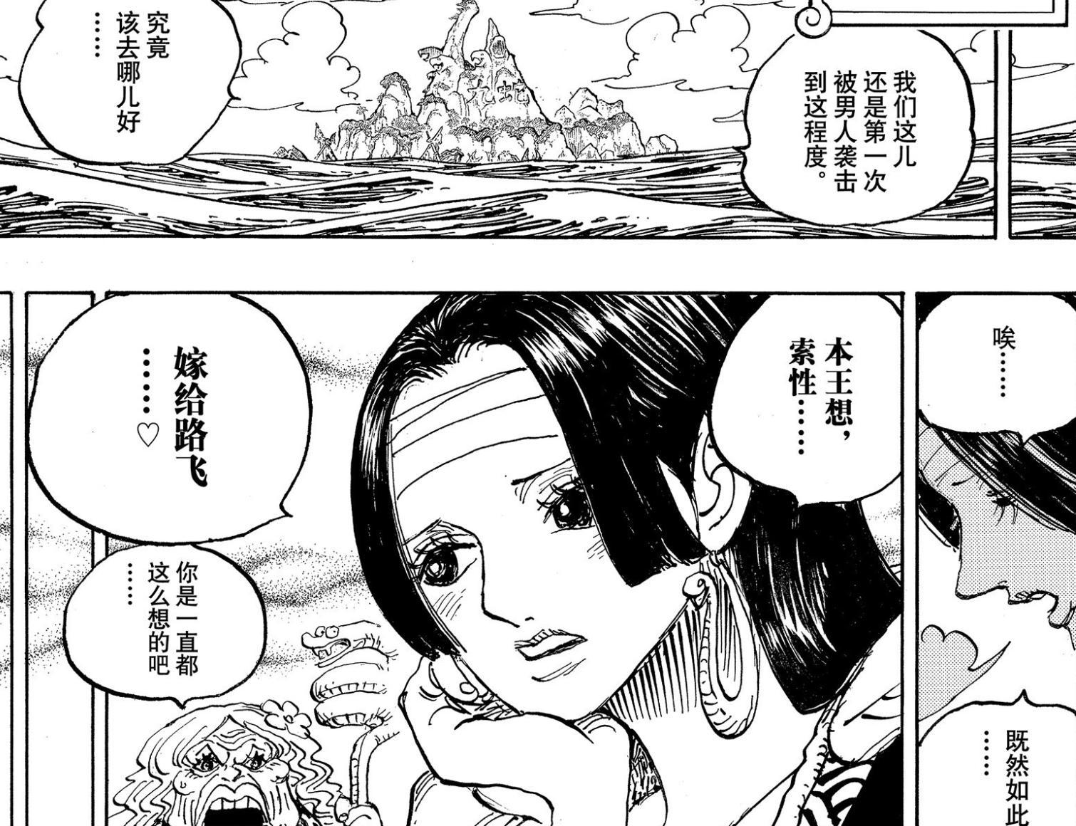 鏡頭轉向女兒島,漢庫克的國家被海軍和黑鬍子海賊團襲擊過,這也讓他們發現處於無風帶的女兒島也並不安全,漢庫克成爲重點關注對象,必須獲得強大的保護才能讓這個國家安全,因此聯想到成爲四皇之一的路飛。