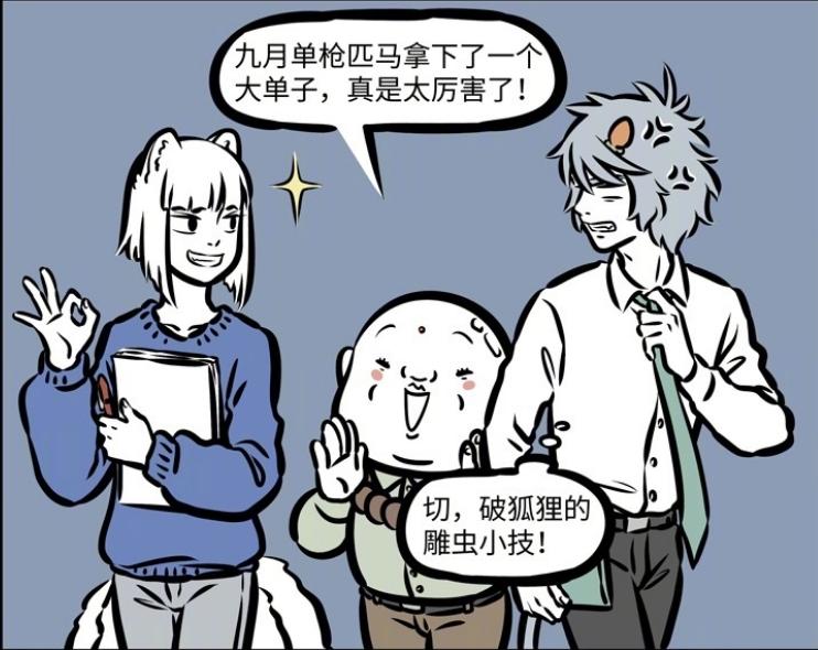 大概是被哮天的業績刺激到,九月也開始在工作上發奮圖強,很快就拿下一個大單子,就連上司老肚都追在九月身後表揚她的出色表現