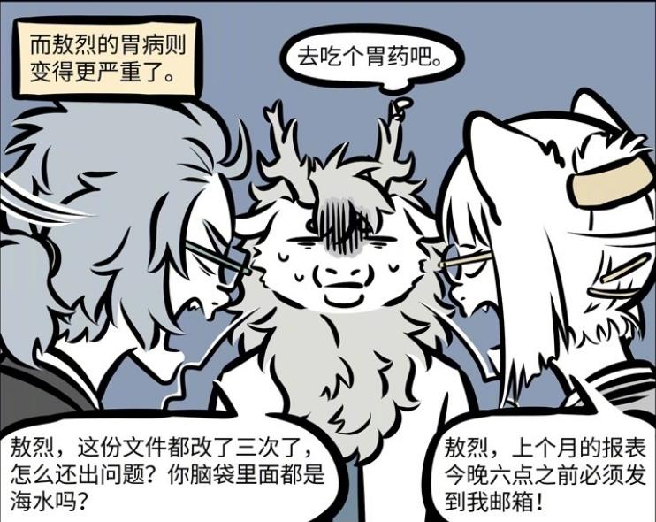 一下子哮天怒斥敖烈一份文件改了三次,工作效率太低,一下九月又要求今天六點前要上個月的工作報表